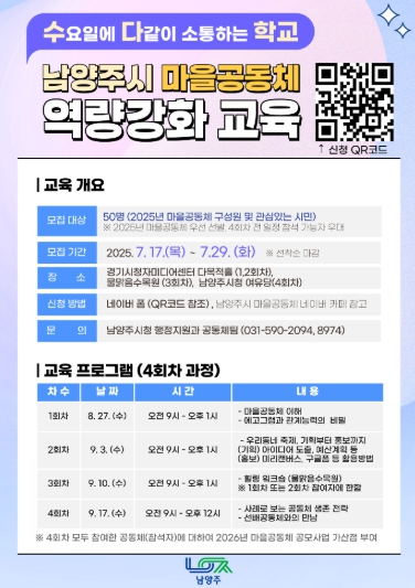 교육에 참여하고자 하는 시민은 7월 29일까지 온라인(사진 QR코드 참조)으로 신청할 수 있으며, 자세한 내용은 남양주시 홈페이지에서 확인할 수 있다.