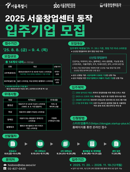 모집 관련 자세한 사항은 스타트업플러스 누리집에서 확인할 수 있으며,관련 문의는 서울창업센터 동작을 통해 가능하다.