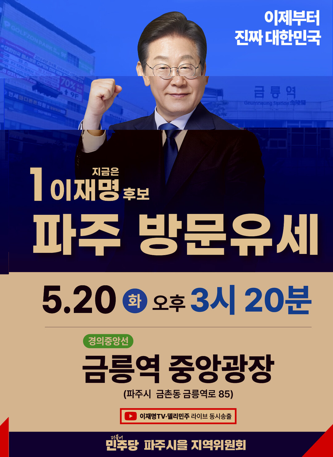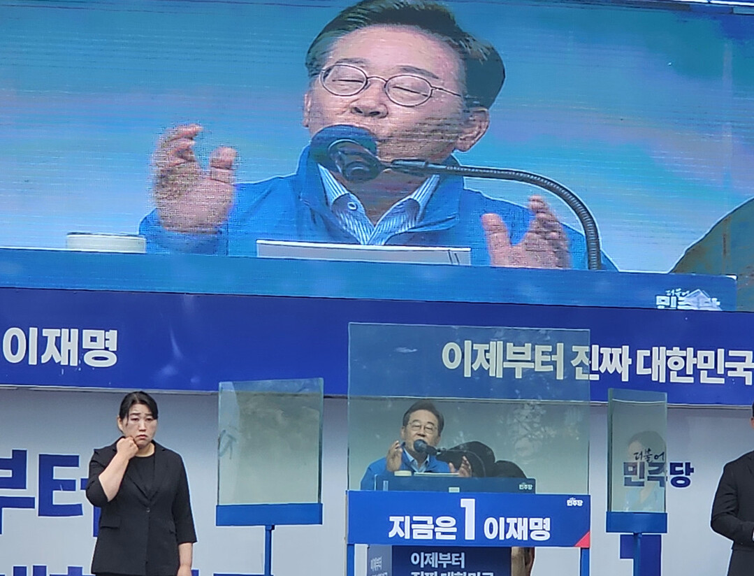 예정보다 늦게 도착한 이재명 후보는 "이자리에 파주 시민들이 전부 다 모인것 같다"며 "파주시민들의 이렇게 뜨거운 열정으로 6월3일에는 희망의 새로운 대한민국, 진짜 대한민국을 만들어 봅시다"라고 외쳤다.