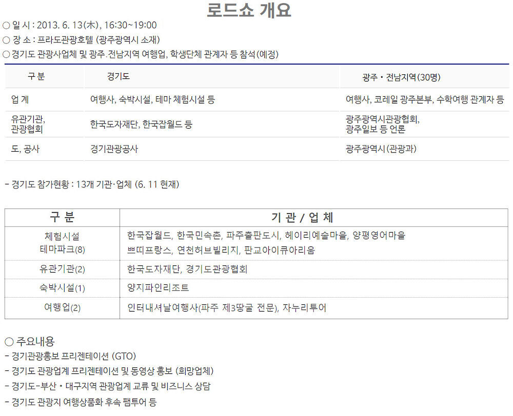 이번 ‘경기관광 로드쇼’에는 한국잡월드, 한국민속촌, 허브빌리지, 도자재단 등이 참여했으며, 이들은 광주, 전남 여행업계와 경기도 여행상품 개발을 위한 실질적 상담과 구매의 시간을 가졌다.