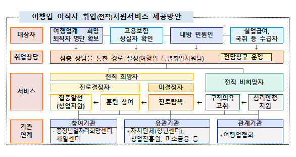 서울고용복지+센터에 설치되는 "여행업 특별취업지원팀"은 서울고용복지+센터 소장을 팀장으로, 중장년일자리희망센터, 새일센터, 여행업협회 등과 협업하여 구성되고, 지방자치단체, 창업진흥원, 미소금융 등과도 연계하여 이직자에게 필요한 다양한 서비스를 제공할 예정이다.