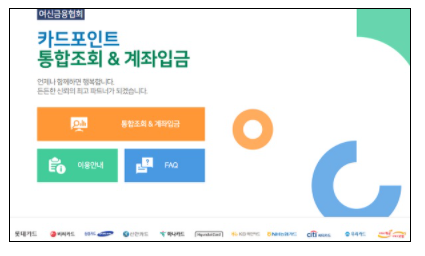 금융위원회는 지난 5일 오전 11시 여신금융협회의 ‘카드포인트 통합조회·계좌이체’ 앱·홈페이지 또는 금융결제원 ‘어카운트인포’ 앱으로 모든 카드사의 포인트를 조회해 한 번에 지정된 계좌로 이체·출금할 수 있는 서비스를 개시한 바 있다.