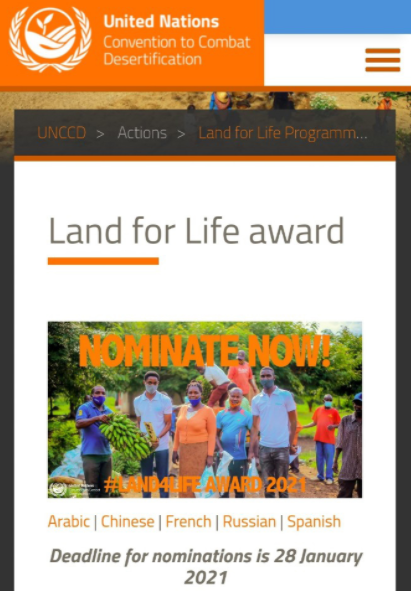 추천기한은 21.1.28(목, 한국시간 15:59분/ 독일시간 23:59)까지이며, 유엔사막화방지협약 누리집을 통해 대상기관을 직접 추천할 수 있으며 보다 자세한 사항은 산림청 해외자원담당관실로 문의하면 된다.