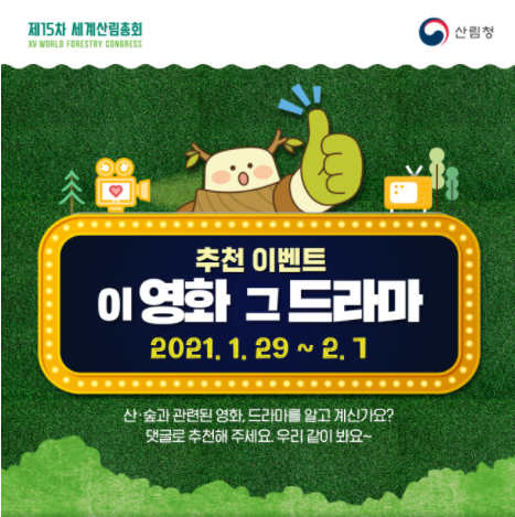 본 행사는 국민 누구나 참여할 수 있으며, 산과 숲을 주제로 하거나 배경으로 하는 영화 및 드라마를 댓글로 추천하는 방식으로 참여가 가능하다.