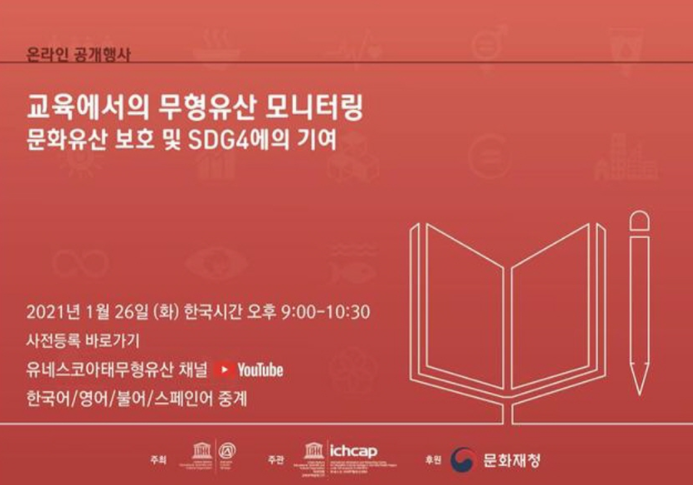 이번 온라인 공개행사는 유네스코 무형유산보호협약 이행 평가를 위한 교육지표 소개, 무형유산 교육 사례 발표, 토론으로 구성된다.