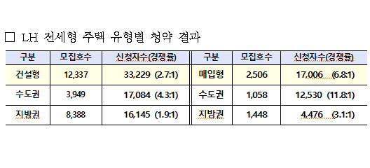 LH는 지난 18~20일 3일간 건설형 12,337호, 매입형 2,506호 등 전국 14,843호의 전세형 주택에 대해 권역별 입주자를 모집했으며, 총 50,235명이 신청해 전국 평균 3.4대1의 경쟁률로 청약을 마감했다.