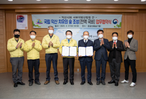 익산시청에서 열린 이날 협약식에는 조준규 서부지방산림청장과 정헌율 익산시장 등이 참석해 국립 익산치유의 숲의 성공적인 조성을 위한 실질적 업무협력과 지원에 공동 노력하기로 했다.