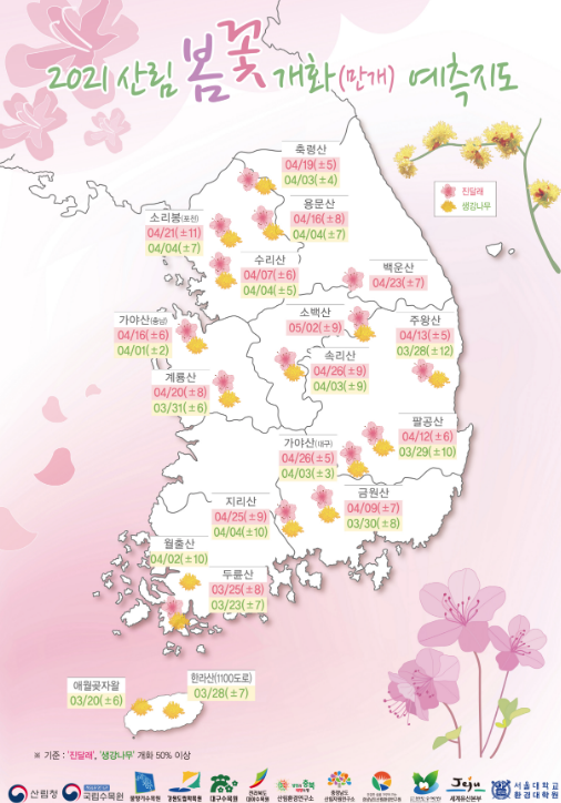 이를 토대로 올해의 산림 봄꽃 만개는 3월 중순 무렵부터 제주도에서 시작되어, 완도를 거쳐 내륙으로 점점 확대될 것으로 보이며, 특히 관측지점의 해발고도가 높은 지리산, 소백산, 속리산에서는 다른 지역보다 봄꽃 만개가 늦을 것으로 예측되었다.