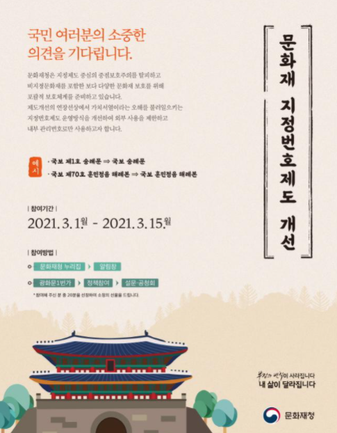 이에 문화재청은 현상변경 허가신청서 등 민간을 대상으로 하는 대외 문화재 행정에서는 지정번호를 사용하지 않고, 내부에서 관리하는 용도로만 지정번호를 사용하는 방안을 마련하고자 한다.