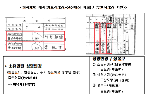 ‘’공적장부 일본이름 지우기“ 사업에 따라 일본식 이름으로 등록된 등기부등본은 존재하나 토지개발사업 등으로 토지대장이 없는 경우에는 등기부등본을 말소하여 공적장부에서 일본식 이름을 삭제 하게 된다.