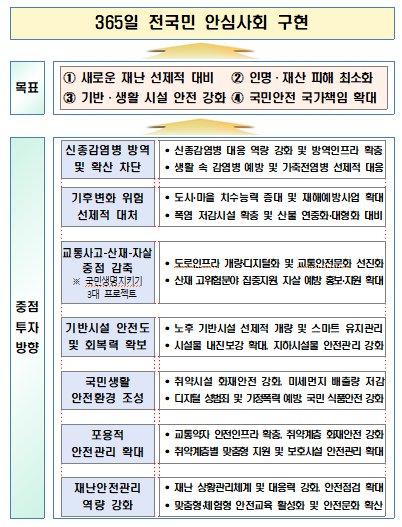 선정된 7대 중점 투자방향은 ①신종감염병 방역 및 확산 차단, ②기후변화 위험 선제적 대처, ③교통사고·산재·자살 중점 감축, ④기반시설 안전도 및 회복력 확보, ⑤국민생활 안전환경 조성, ⑥포용적 안전관리 확대, ⑦재난안전관리 역량 강화이다.