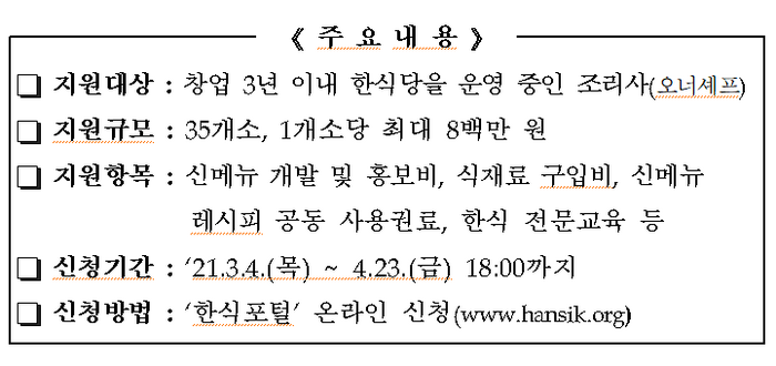 오는 4월 평가를 통해 대상자로 선정되면 한식당 경영을 위한 교육에 참여하고 신메뉴를 개발하게 되며 개발된 신메뉴는 5개월 동안 판매해야 한다.
