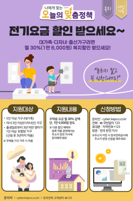 [지원내용] 주택용 요금 월 30% 감액. 단, 1만 6,000원 한도