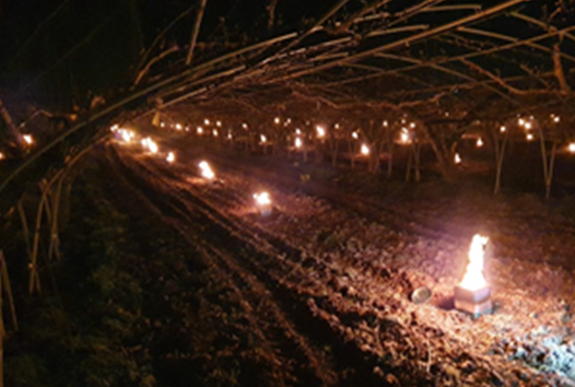 대표적인 저온 피해 예방 기술로는 △위쪽 따뜻한 공기와 땅의 찬 공기를 순환시키는 방상팬(바람) △물을 뿌려 물이 얼 때 방출하는 열로 작물이 어는 것을 막는 살수장치(물) △불을 피우는 연소법을 들 수 있다.
