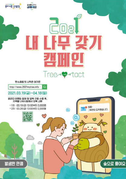 금년 「2021 내나무 갖기 캠페인」은 2회에 걸쳐 묘목 교환권인 ‘그루콘’을 총 5,000매 선착순 배부할 예정이며, 많은 국민에게 참여 기회를 골고루 주기 위해 1인 1회 참여만 가능하다.