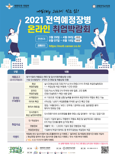 전역장병들의 안정적인 사회진출을 지원하기 위한 이번 박람회는 “힘내라 국군장병! 내일(My Job)이 있는 삶을 위하여”라는 슬로건 아래 고용노동부, KB국민은행 등의 후원을 받아 진행된다.
