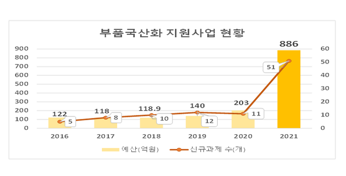 ‘부품국산화 지원사업’은 무기체계에 사용되는 핵심 부품 중 국외에서 수입하는 부품을 국내 제품으로 개발하는 사업이다. 올해는 방위산업 육성 및 발전에 관한 법률 시행에 따라 부품국산화 지원대상이 확대되었고 이에 따른 예산 (2020년 203억 원 -> 2021년 886억 원) 및 신규 지원 과제 수(2020년 11건 -> 2021년 51건 예상)가 대폭 증가하였다.