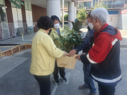 식물의 종류는 미세먼지 저감 효과가 높은 소나무 한그루의 화분을 포함하여 공기정화능력이 뛰어난 고무나무, 해피트리 등 총 7가지 나무들을 소나무 상자에 담아 보은보건소 등 선별진료소 17개소에 직접 전달하였다.