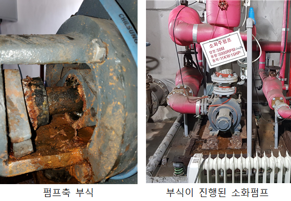 소화 펌프의 축과 임펠러 등을 가격이 저렴한 주철제로 사용하고 있어 부식이 발생할 가능성이 있었으나 앞으로는 청동, 스테인리스 등 부식에 강한 재질을 사용하도록 한다.