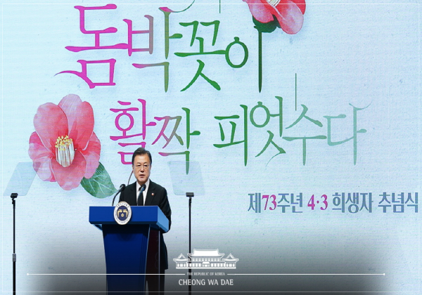 대통령은 “완전한 독립을 꿈꾸며 분단을 반대했다는 이유로 당시 국가권력은 제주도민에게 ‘빨갱이’ ‘폭동’ ‘반란’의 이름을 뒤집어씌워 무자비하게 탄압하고, 죽음으로 몰고 갔다”며 “그러나 4·3은 대립과 아픔에 갇히지 않고 살아남은 제주도민들은 서로를 보듬고 돌보며 스스로의 힘으로 봄을 되찾기 위해 노력해왔다”라고 했다.