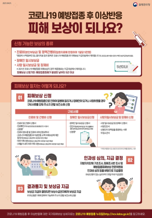 코로나19 예방접종으로 인하여 질병에 걸리거나 장애인이 되거나 사망하였을 경우 구비서류를 갖춰 주소지 관할 보건소에 신청
