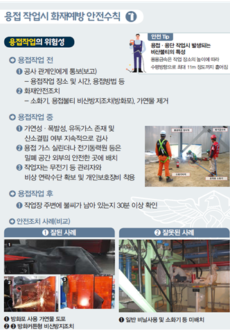 한편, 소방청은 용접·용단 등 화재위험작업시 화재예방수칙을 철저히 준수할 수 있도록 대형 공사장에 대한 소방서장의 현장지도를 강화하고, 불시단속도 추진한다.