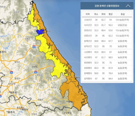 [산불발생위험, 실효습도, 풍속, 대규모 소나무 숲 존재 여부를 고려하여 발령(참고 1)]