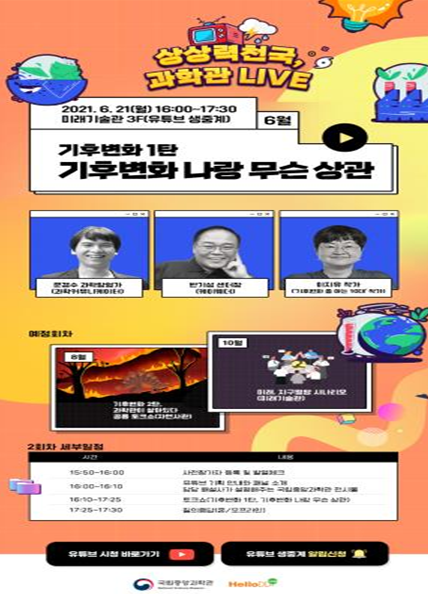 「상상력천국, 과학관생방송(Live)」는 6.21. 오후 4시부터 90분 동안 유튜브 채널 ’국립중앙과학관‘에서 생중계(라이브)로 방송될 예정이며, 실시간 채팅에 참여 후 응모한 관객을 대상으로 추첨을 통해 상품을 제공하는 행사(이벤트)도 마련되어 있다.