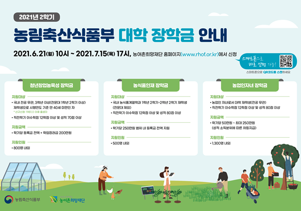 [‘사람이 살아가는 오늘 뉴스’ today1] 농림축산식품부는 농림축산식품산업분야 인재를 육성하고, 농업인의 교육비 부담을 줄이기 위해 대학생에게 장학금을 지원한다.