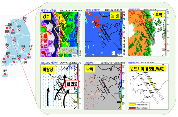 기존에는 인천공항의 강수 정보만 제공했으나, △전국공항(16개)에 대해 모든 위험기상정보(강풍·폭우·태풍·낙뢰·우박 등)로 확대하였고 △강수 △우박 △낙뢰 △바람 △눈·비 영역 △윈드시어 경보 등을 제공하여 안전한 공항운영을 지원한다.
