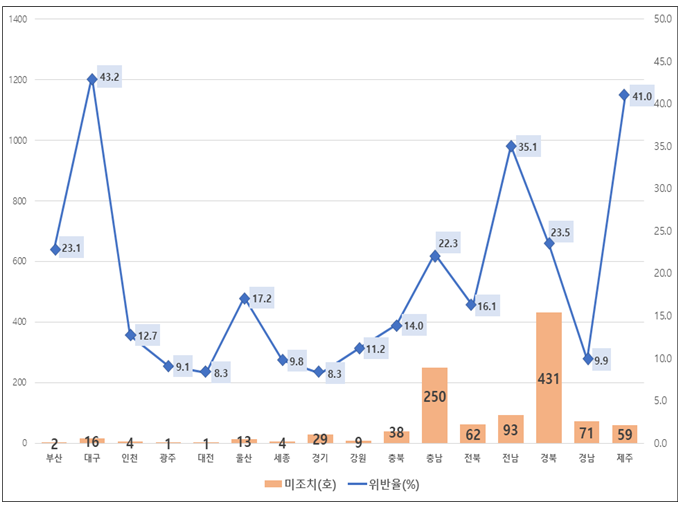 위반율이 높은 지역은 대구(점검농가 대비 43.2%), 제주(41%), 전남(35.1%), 경북(23.5%), 부산(23.1%), 울산(17.2%) 순으로 나타났다.