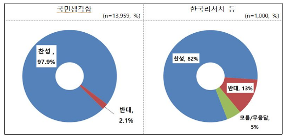한편, 이번달 24일 한국리서치 등 4개 여론조사기관에서 전국 만 18세 이상 남녀 1,006명을 대상으로 같은 내용을 조사(표본오차 95% 신뢰수준에서 ±3.1%포인트)한 결과, 찬성하는 답변이 82%, 반대의견이 13%, 모름/무응답 5%로 집계됐다.