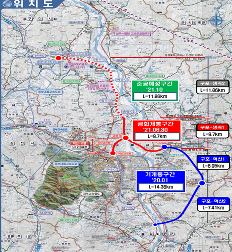 이번 개통으로 구미시 시가지와 국가산업단지를 우회하여 도심지 도로의 교통혼잡을 완화하고, 기존 국도 대비 통행시간이 14분(30분→16분) 이상 단축되는 등 도로이용자 편의가 크게 증진될 것으로 기대된다. 아울러, 금년말 구포-생곡2(11.9km) 구간이 준공되면 구미시 국도대체우회도로 전 구간(35.9km)이 모두 개통된다.