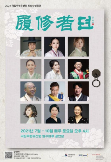 '이수자뎐(傳)' 차세대 무형유산의 전승주역인 이수자들이 활약할 수 있는 공연의 장을 넓히고자 추진되는 공모 공연으로 매년 무형문화재 예능 종목 이수자들을 대상으로 작품을 공모·심사하여 선정된다. 올해는 국가무형문화재 총 12편이 선정되어 무대에 오른다.