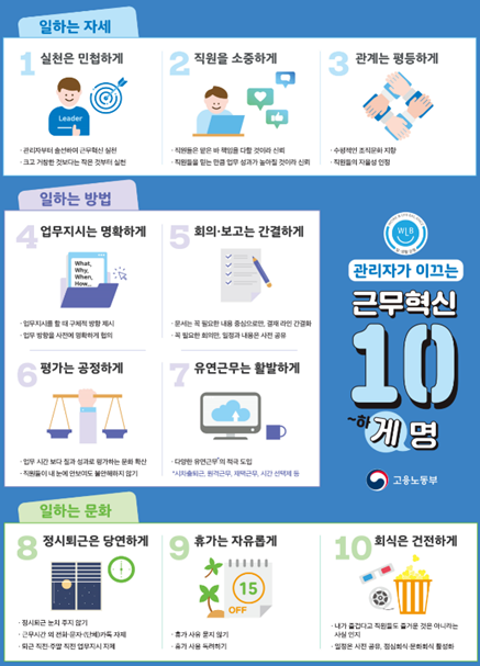 ‘근무혁신 인센티브제’는 중소·중견기업이 자발적으로 근무혁신 계획을 수립하고 실천하여 우수기업으로 선정되면 3년간 정기 근로감독 면제, 각종 정부지원사업 우대 등 다양한 혜택을 주는 제도이다.