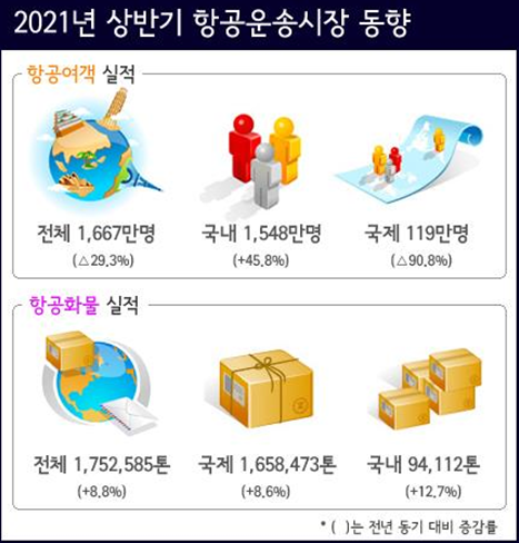 국내선 여객은 1,548만 명으로 전년 동기 대비 45.8% 증가(’19년 동기 대비 △3.2%)한 반면, 국제선 여객은 119만 명으로 전년 동기 대비 90.8% 감소(’19년 동기 대비 △97.4%)했으며, 항공화물(순화물+여객 수하물)은 총 175만 톤으로 전년 동기 대비 8.8% 증가(’19년 동기 대비 △16.2%)하였고, 수하물을 제외한 순화물의 경우 코로나 상황에서도 21.6%(’19년 동기 대비 17.2%) 증가했다.