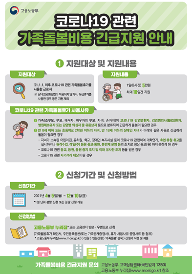 한편, 고용노동부는 「코로나19 관련 가족돌봄비용 긴급지원」을 통해 가족돌봄휴가를 사용한 근로자에 대해서 최대 50만원의 돌봄비용을 지원하고 있다.