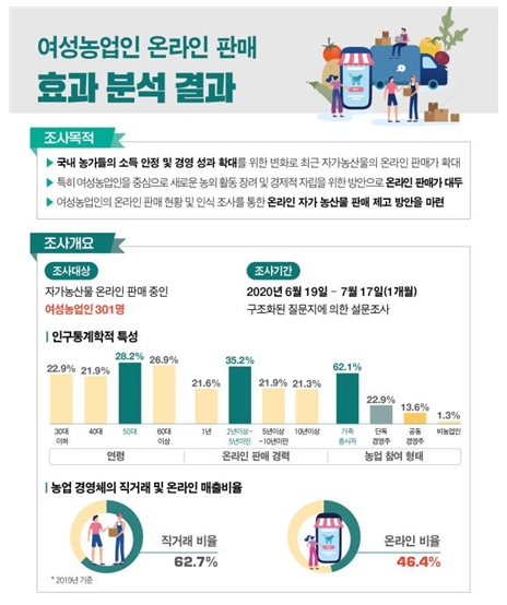 온라인 판매 동기와 어려움을 조사하고, 온라인 판매 효과에 대한 인식을 측정(5점 척도)한 결과, 여성농업인의 온라인 판매는 농가의 경제적 효과는 물론 농업경영인으로서 자신감을 높이는 데 도움을 주는 것으로 나타났다.