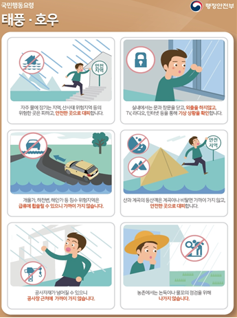 김현수 장관은 취약지역과 시설 등을 철저히 점검·보완하여 피해를 예방할 수 있도록 각 기관에서 총력을 기울여 줄 것을 지시하는 한편, 농업인들께 인명과 재산피해가 없도록 시설 및 농작물 피해예방 요령과 태풍·호우대비 국민행동요령* 등을 사전에 숙지하고 준수해 달라고 당부하였다.
