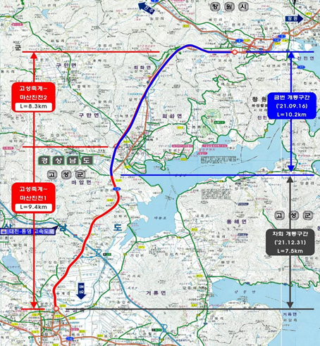 아울러, 본 사업의 잔여구간(고성군 고성읍~마암면, 7.5km)도 오는 12월말 개통을 목표로 정상적으로 공사를 진행하고 있다.